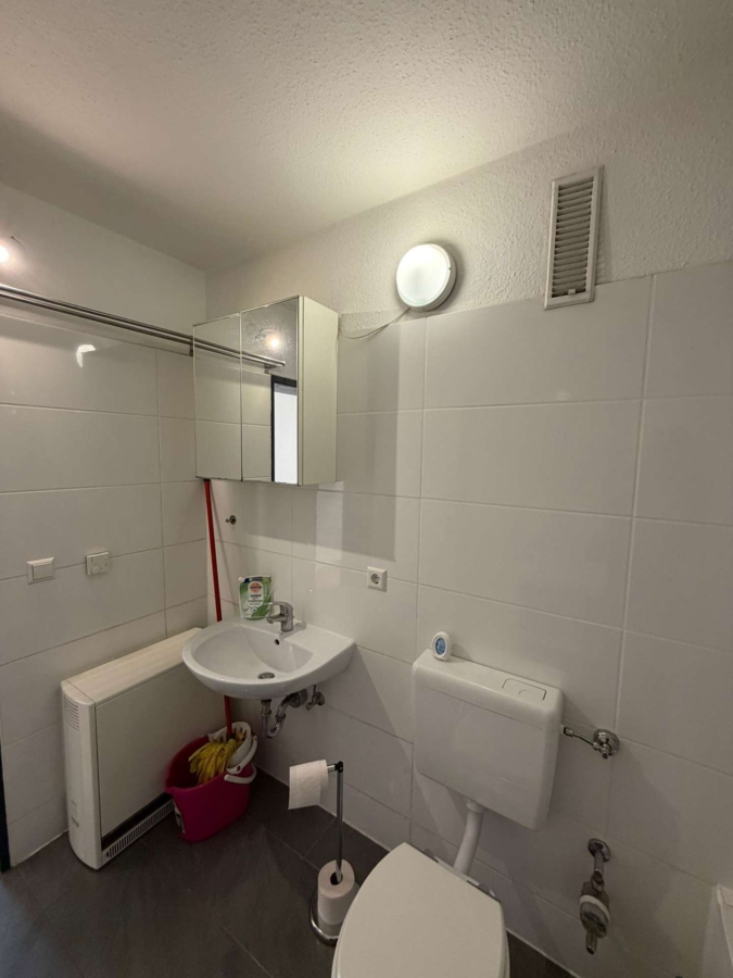 Das Badezimmer ist weiß gefliest und mit Badewanne sowie WC ausgestattet. In den Wohnräumen und im Flur ist ein Laminatboden in Holzoptik verlegt, was für eine warme und gepflegte Wohnatmosphäre sorgt.